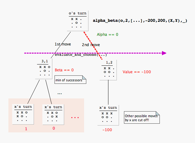 Vejamos o que acontece quando Prolog calcula o último movimento mostrado no jogo acima. O diagrama a seguir ilustra graficamente o que acontece com as escolhas de 'o' além do primeiro movimento possível (e criticamente melhor). Todos os movimentos são expandidos na ordem gerada pelo programa. O segundo movimento possível [x,x,_,o,o,_,_,_,_] dá a 'x' a oportunidade de escolher sua vitória [x,x,x,o,o,_,_,_,_]. Nosso maximizador, 'o', não tolerará isso e não continuará a buscar. O α-cutoff é a aresta vermelha tracejada da raiz para a escolha da segunda camada: Observe que 'cuttoff' é chamado por 'evaluate_and_choose' que pode, portanto, truncar as possibilidades! O valor de backup Alpha == 0 foi obtido da busca mais à esquerda: O melhor que pode ser garantido com este movimento.